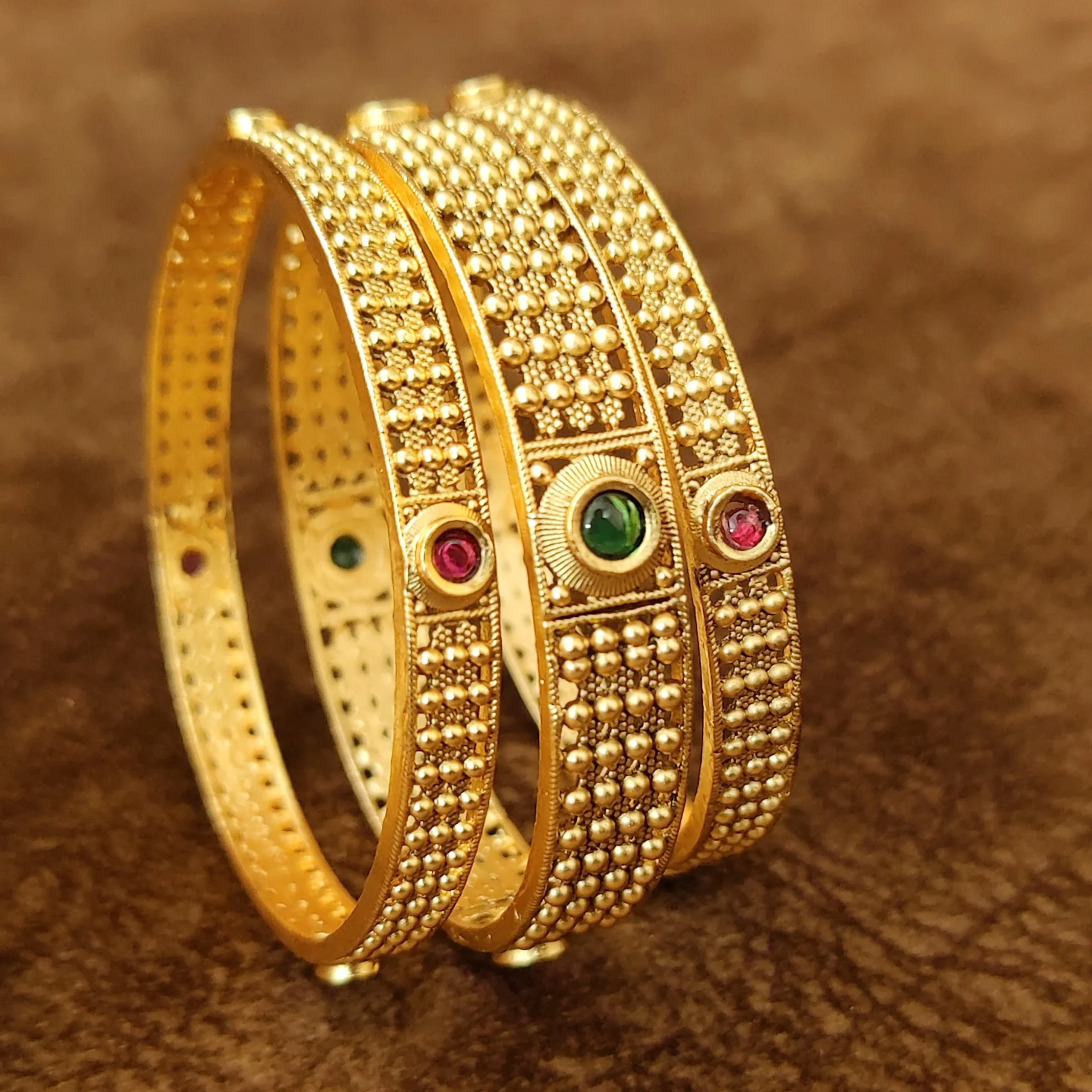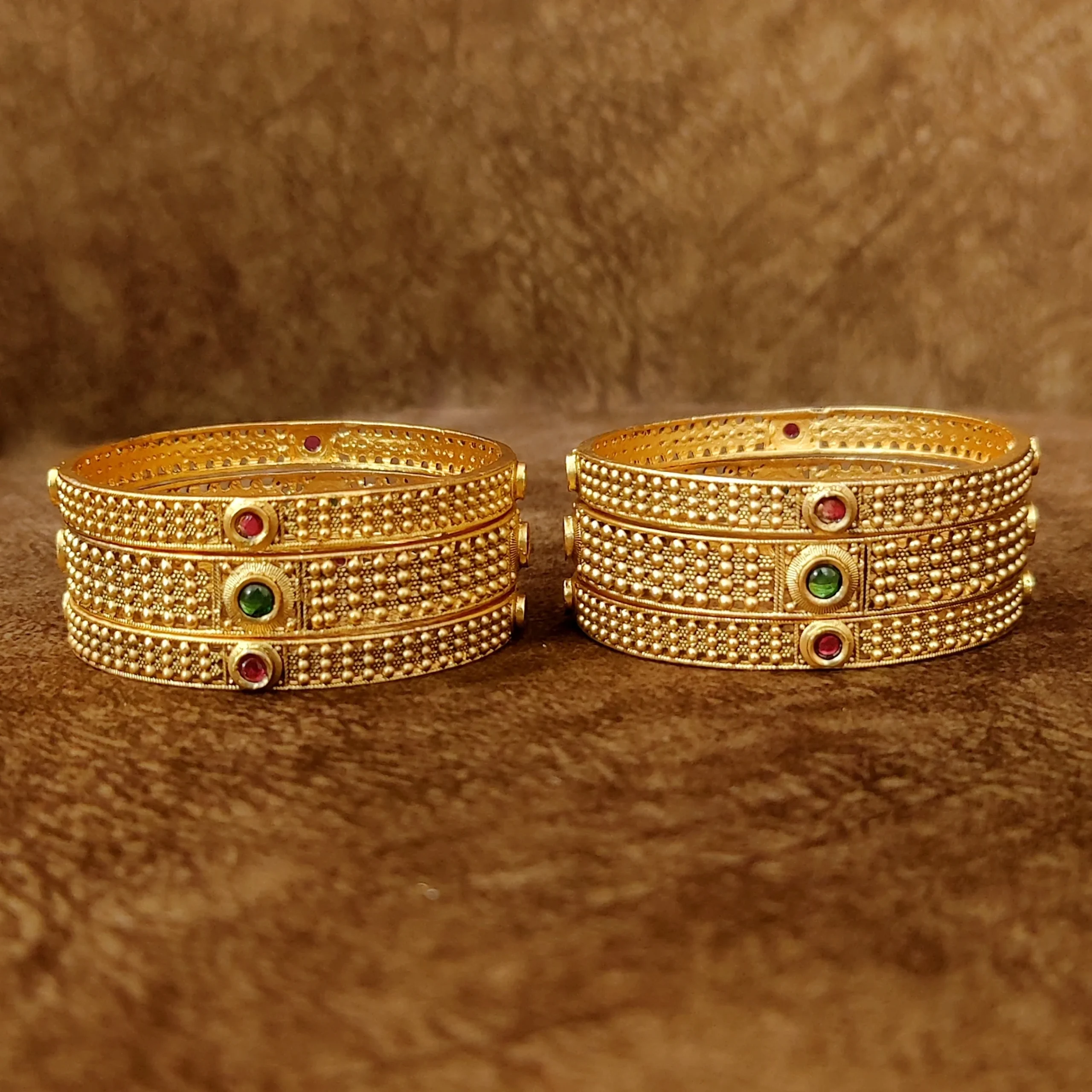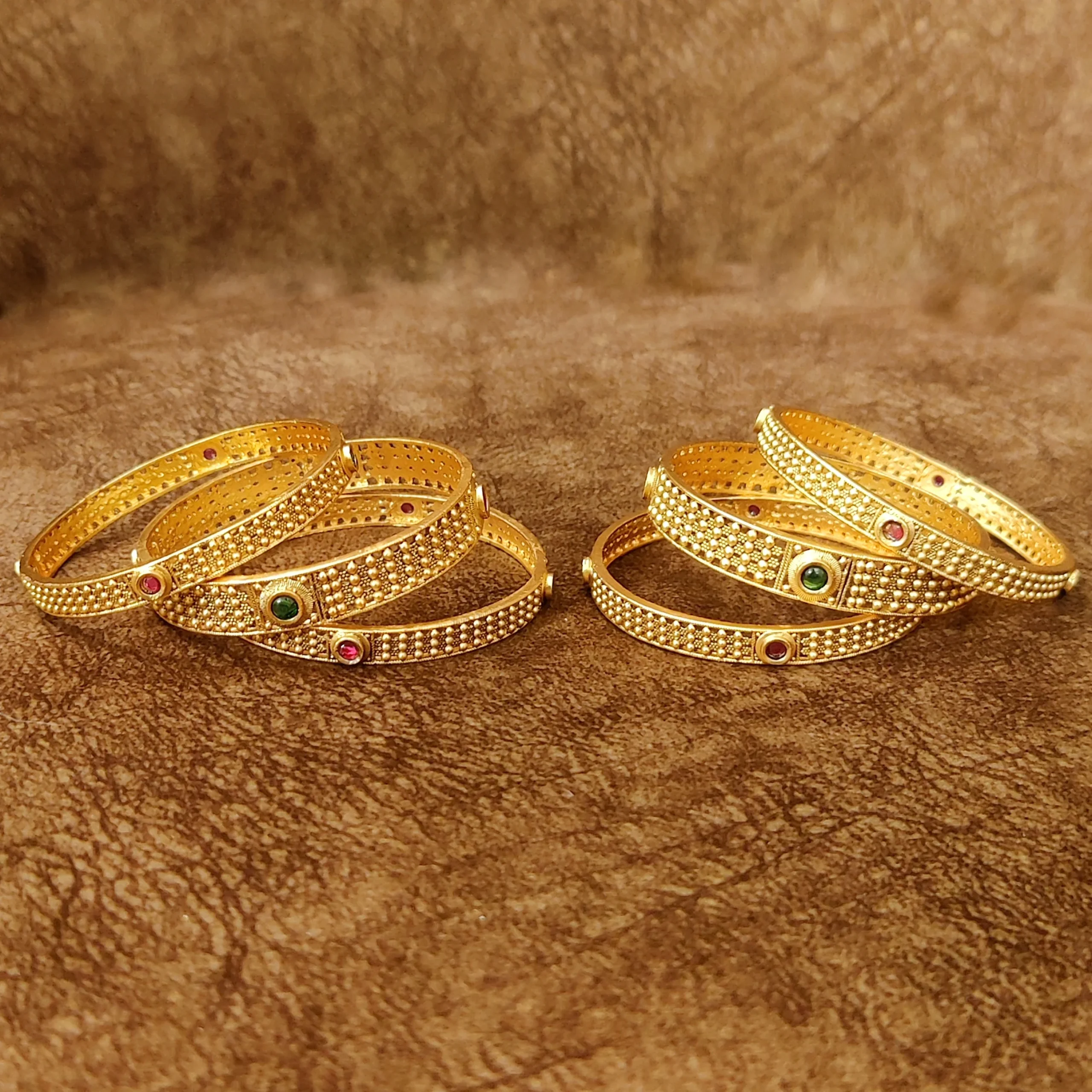 Set of six gold-plated bangles, each has intricate textured details, secured with slip-on closure